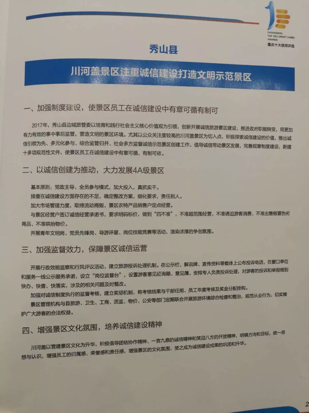 近日由重庆市社会信用体系建设联席办公室、重庆市发展和改革委员会指导,新华社中国经济信息社主办,重庆市信用中心、新华社中国经济信息社新华信用事业部、新华社中国经济信息社重庆中心、重庆华龙网集团股份有限公司承办,重庆华龙强渝信用管理有限公司协办的“2017年重庆十大信用典型案例”评选活动已经结束,秀山县发展和改革委员会申报的《川河盖景区注重诚信建设打造文明示范景区》荣获“2017年重庆十大信用典型案例优秀案例”。